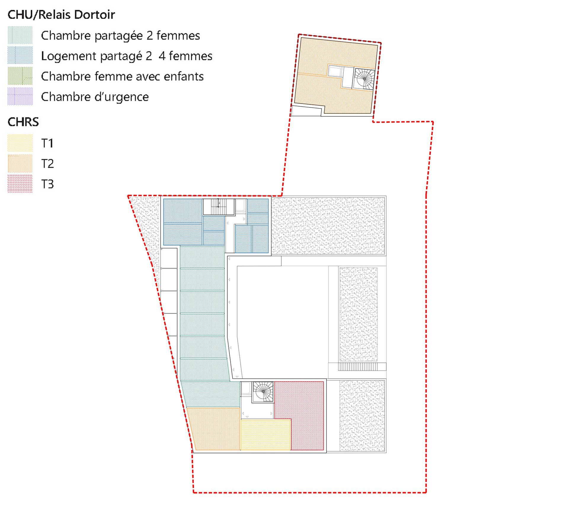 L’étude de faisabilité d’un foyer d’hébergement d’urgence et de réinsertion sociale à destination exclusive de l’accueil des femmes et de leurs enfants a impliqué une approche singulière de la programmation qui devait aller au-delà des objectifs chiffrés de surfaces. Cette étude appuyée d’enquêtes sociologiques menées sur les sites d’accueil de l’association La Main-Tendue à Aubervilliers a permis de définir le niveau de confort architectural (matérialités, équipements…) autour de la notion d’espace vital de l’intime, mais a aussi servi à délimiter les seuils des espaces mutualisables dans le cadre d’une cohabitation de deux femmes, ainsi que penser l’articulation globale des espaces communs comme lieux d’entraide, là où se déploie la sororité.