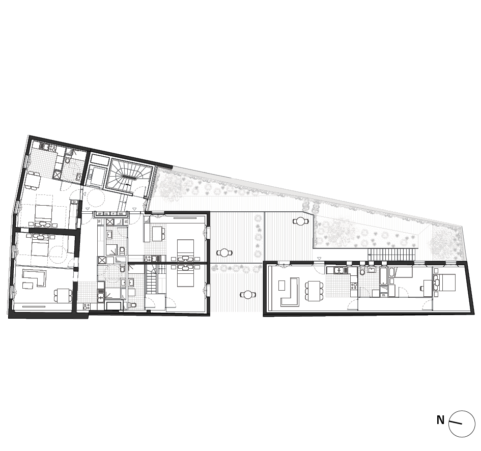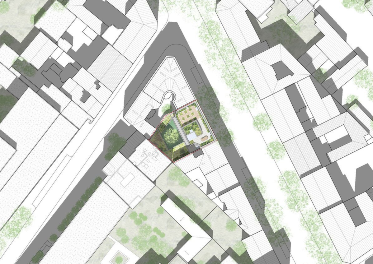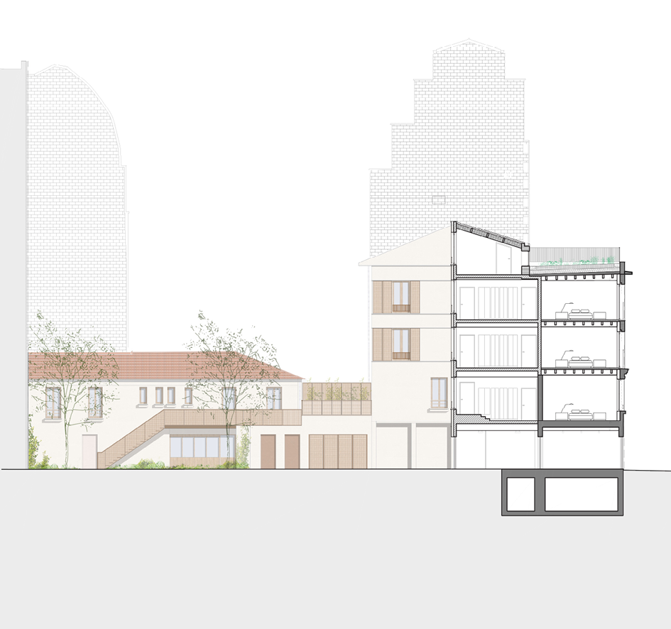 L'ambition première du projet de restructuration est la création d'un îlot de fraîcheur, relais de biodiversité, grâce à l'espace libre dégagé en coeur de parcelle. La continuité des façades sur cour participe à la formation d'une "forteresse" minérale, au sein de laquelle prend racine un jardin accessible à l'ensemble des habitants.