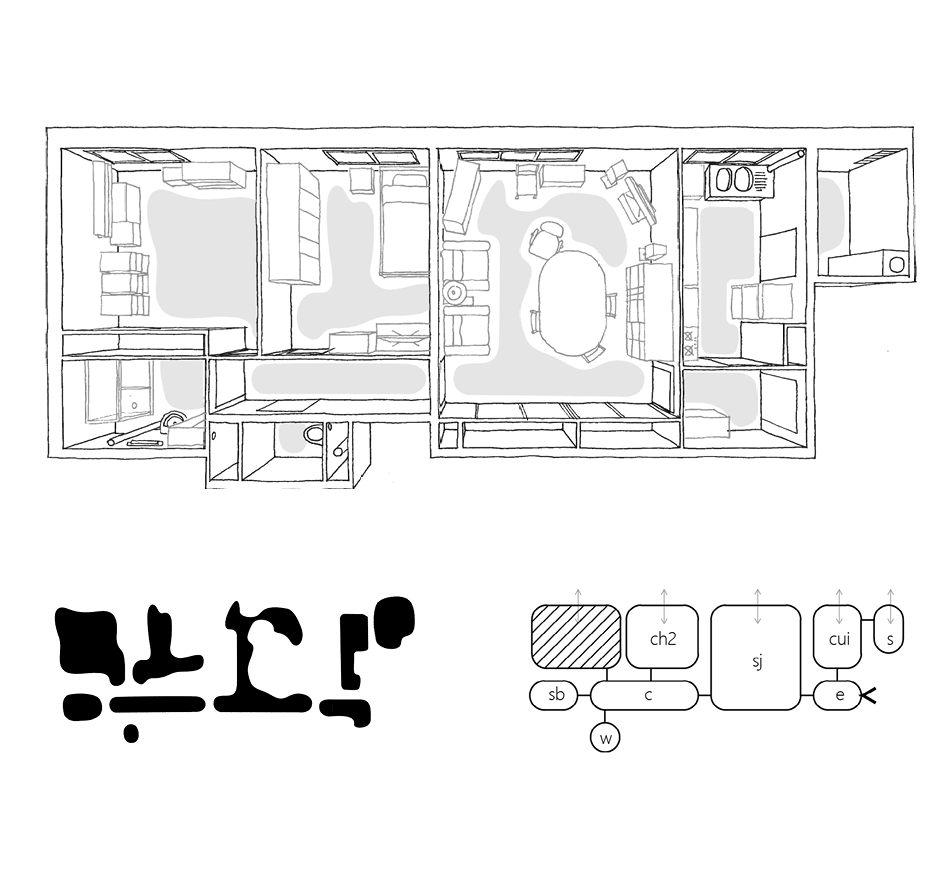 9/11 Typologie 03 B | Chambre pour femmes avec enfants, plan en L chronotopique