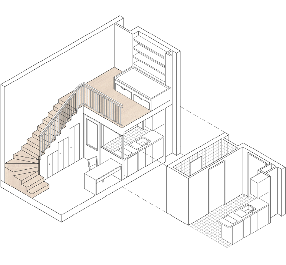 | Axonométrie chambre étudiante