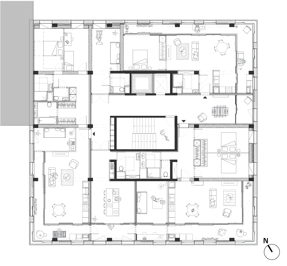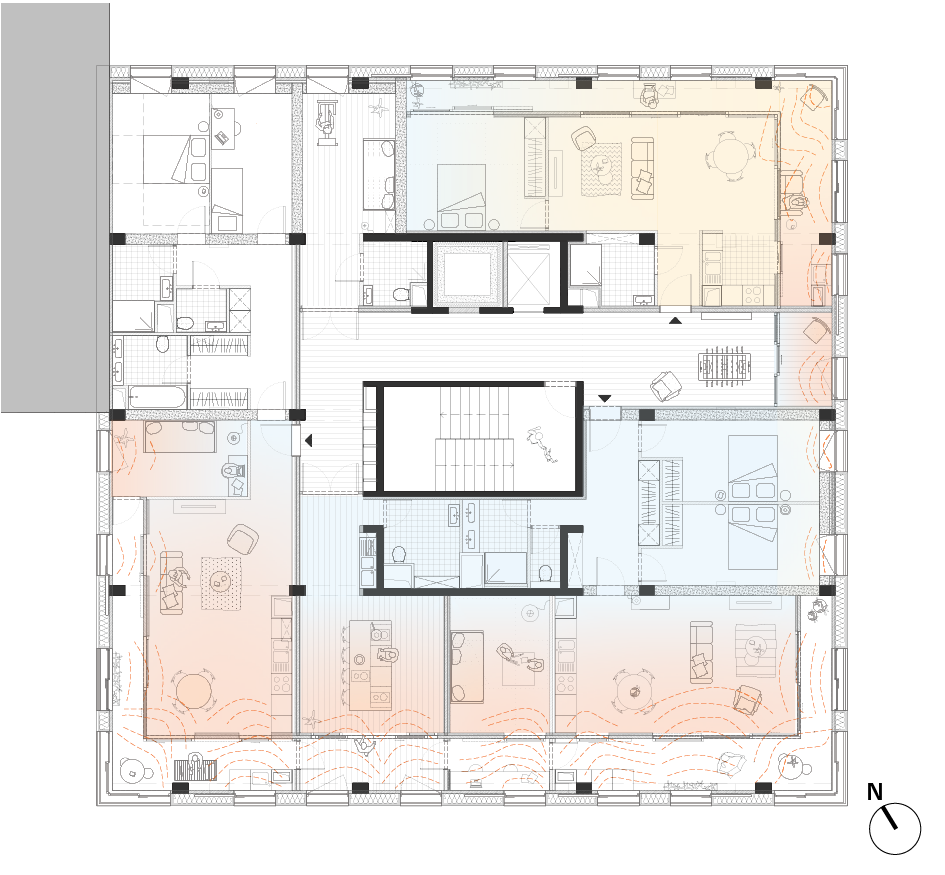 | Plan étage courant - apports solaires en hiver