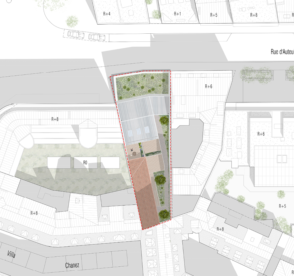 Dans une logique d’addition et de soustraction des volumes existants, le projet vise la densification intelligente de la parcelle. Les bâtiments existants articulés autour d'une cour sont conservés et complétés avec soin.
