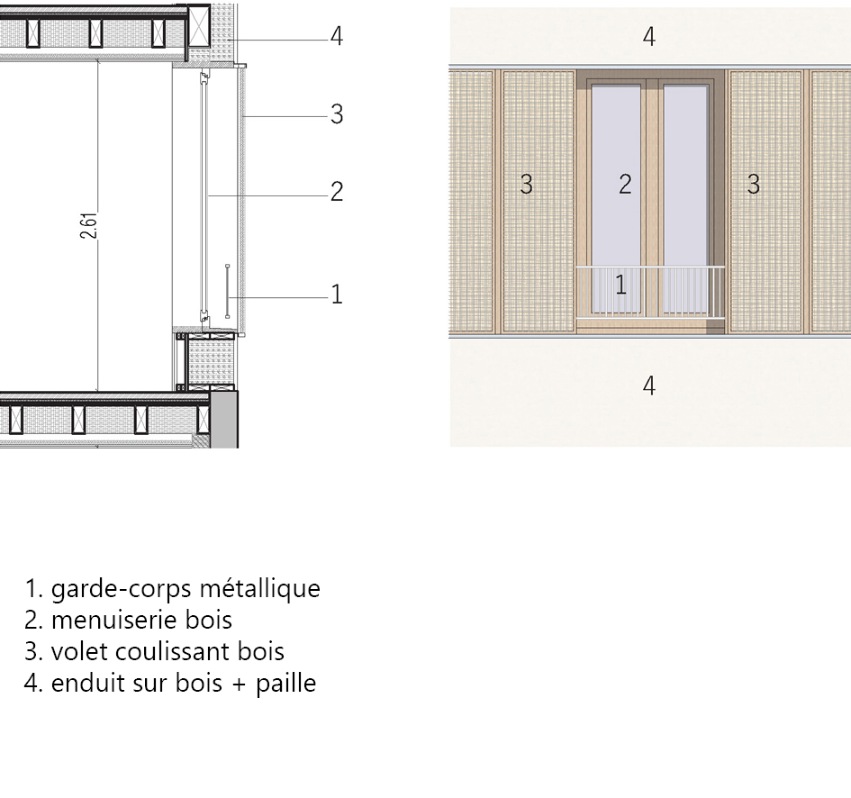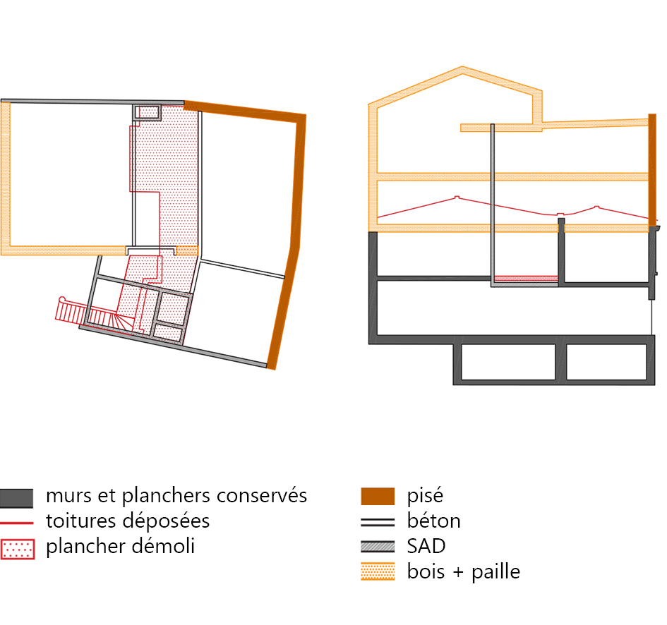 MODES CONSTRUCTIF : surélévation en structure bois (planchers solivés et façade ossature bois), mur préfabriqué en pisé porteur sur rue, murs bois-paille sur cour