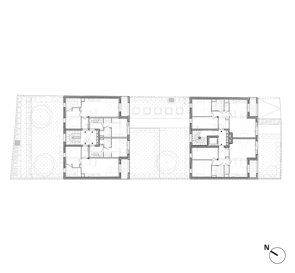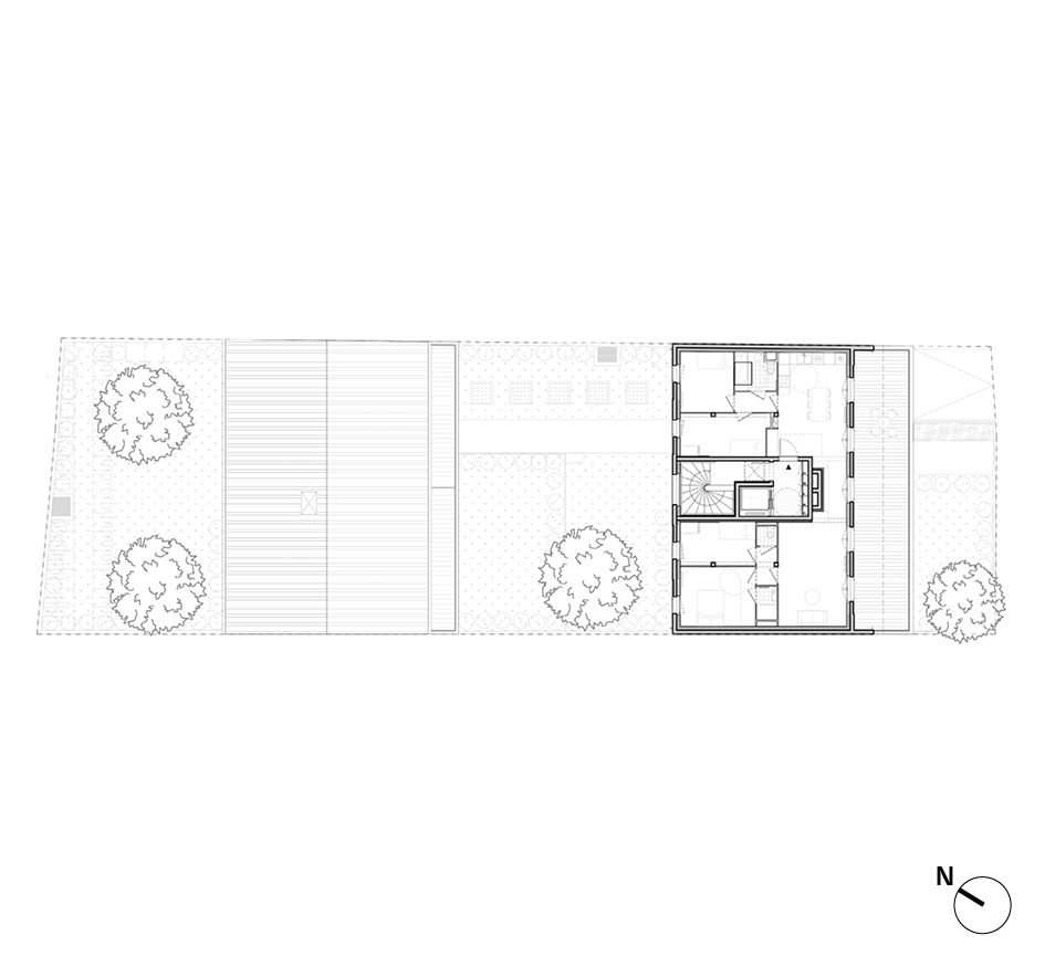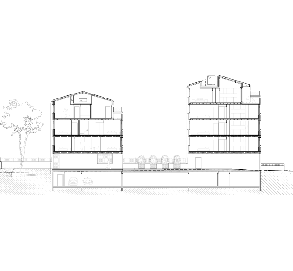 Situé entre la métropole et le quartier, le site est à la charnière entre autoroute, gare RER et tissus pavillonaire diffus largement végétalisé. L'enjeu du projet réside donc dans la densification douce, entre le vivre-ensemble (métropole hyper-connectée) et le vivre chez-soi (individualité, paysage). Deux volumes s'adossent aux pignons de la parcelle voisine, permettant ainsi de limiter les pigons visibles et de séquencer le terrain en trois jardins.