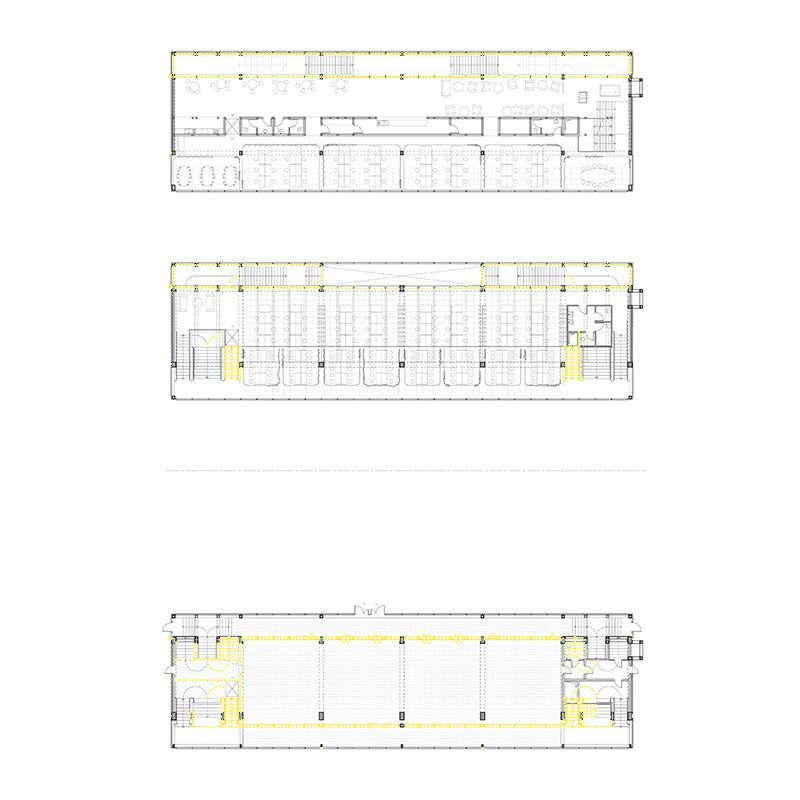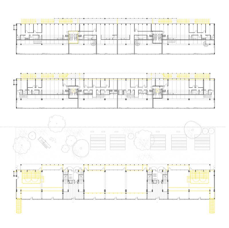L'analyse des anciennes tribunes a révélé deux bâtiments aux morphologies différentes. Le plus long, en gradins, peut accueillir un programme de logements et d'ateliers d'artistes. Le second, composé de différents paliers et de loges, peut être transformé en différents espaces de bureaux et d'exposition. L'approche se veut économe et compose au plus près du "déjà-là", avec des choix précis sur les éléments démolis et la mise en valeur de ce patrimoine du début du XXe siècle. Ainsi, les planchers viennent se poser sur la structure existante, permettant la création d'un vide pour le passage des réseaux et le bois en façade souligne par contraste la structure béton.