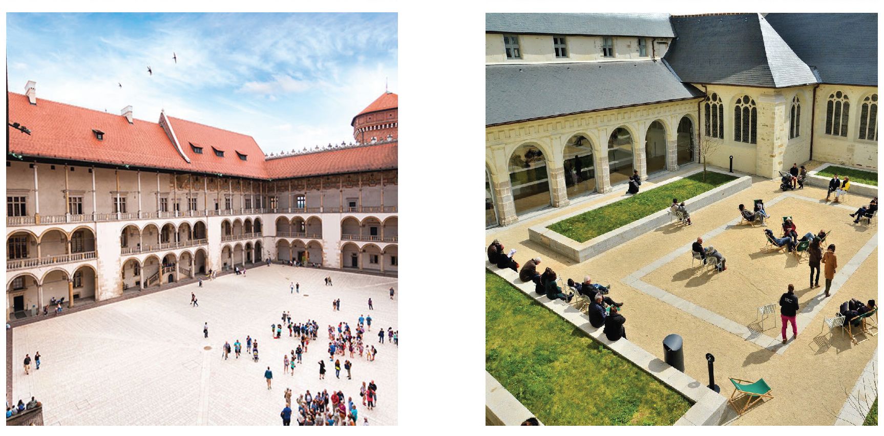Les fonctions du programme trouvent ainsi une résonnance avec les édifices de cloîtres. L’article de la revue Habiter 303 portant sur cette thématique rappelle l’importance des activités (maraîchage, préparation des repas...) dans le fonctionnement de la communauté au-delà de l’aspect religieux. Les lieux sont organisés avec une majorité d’espaces partagés ayant une fonction sociale (cuisiner, jardiner...), organisés majoritairement au rez-de-chaussée en U ou en O autour d’une cour centrale. Ainsi la faisabilité propose une cour commune centrale entourées de coursives protégées. Car le rôle et l’enjeu du foyer la Main-Tendue réside aussi dans la dynamique d’insertion autour de cette communauté de femmes pour permettre une transition et une ouverture vers l’extérieur.