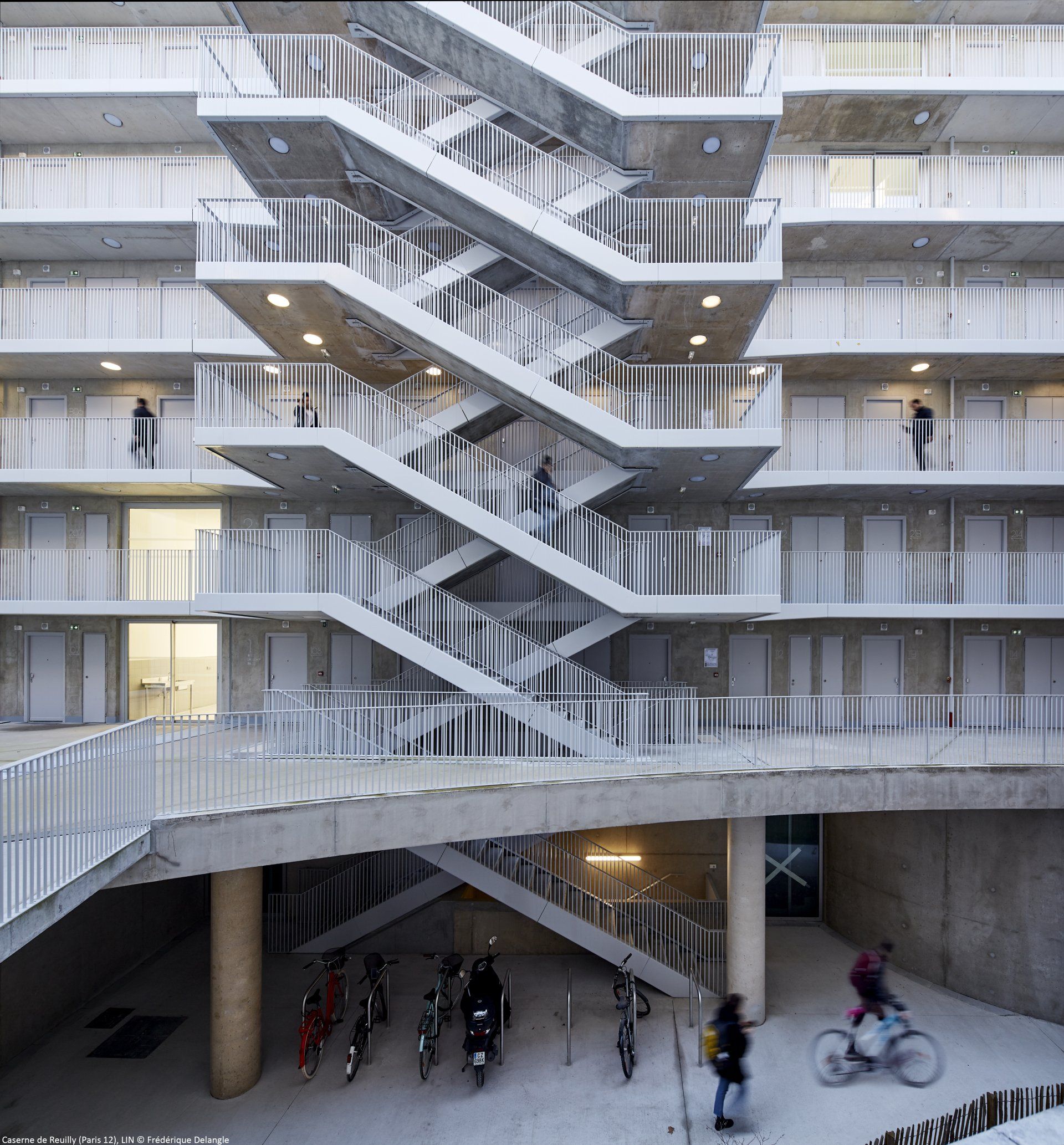 L’échelle du commun se retrouve dans les limites entre l’espace public et l’espace privé. Penser les transitions avec la ville, c’est réfléchir aux différentes manières d’entrer chez soi, de rythmer ce passage par des seuils successifs. Le bâtiment du Foyer Jeunes Travailleurs de Montrouge est ainsi conçu en séquences aux volumes contrastés. Les matériaux minéraux retenus pour les circulations évoquent des rues intérieures, prolongement de la ville à l’échelle du bâtiment. Ces dispositifs de ballades architecturales sont sources de glissement entre les sphères du commun, du voisinage et du domestique.