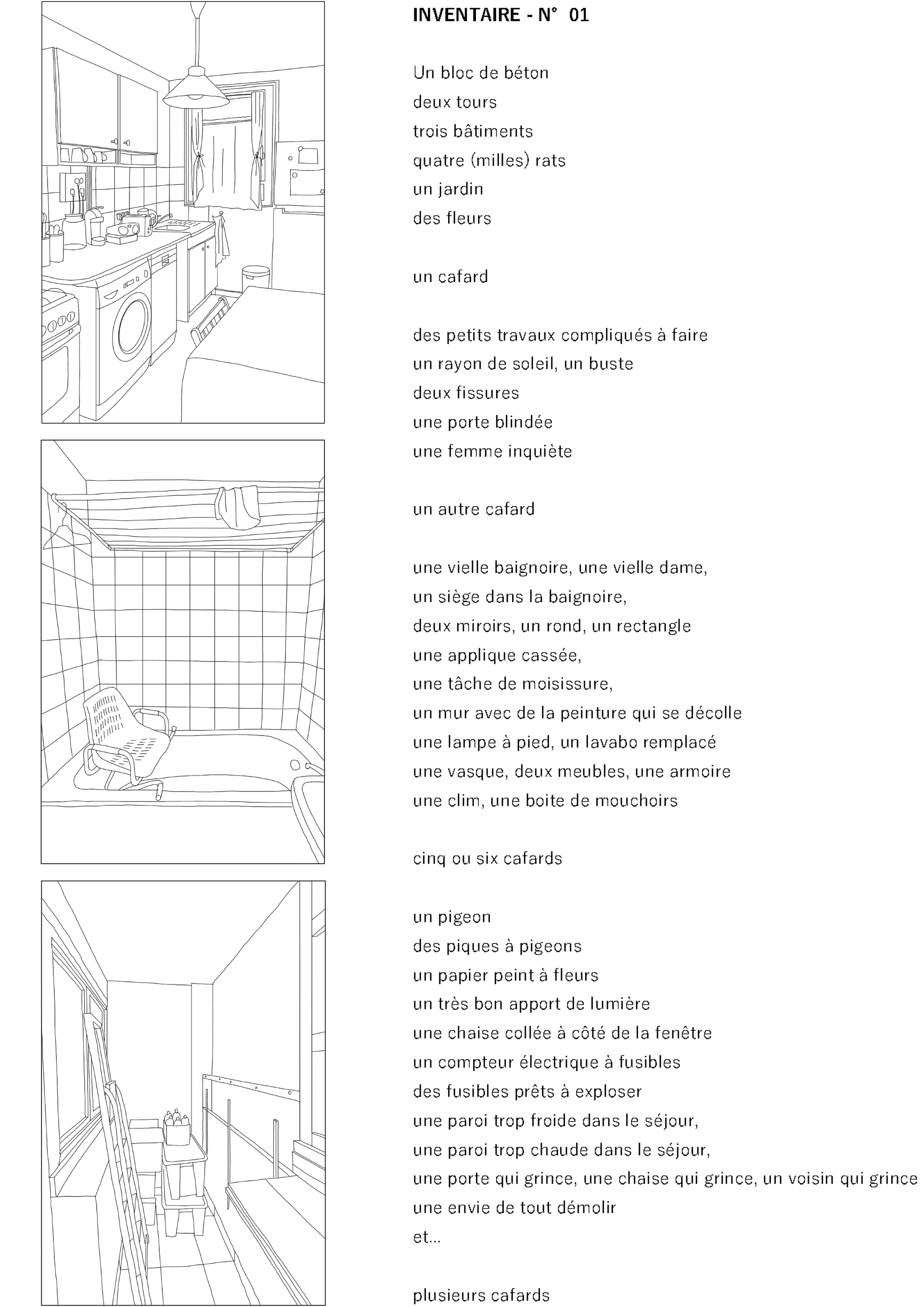 « Inventaire » est particulièrement empreint du désarroi des foyers qui accompagne la période de l’après-guerre, par l’ampleur des démolitions, des désordres et l’invasion de ratons laveurs. Guidée par un questionnaire, les réponses des habitants sont résumées librement dans le choix de mots ou d’expressions imagés. Suivant la composition du poème original, les strophes sont systématiquement entrecoupées par le passage répétitif des cafards, des pigeons ou des rats, omniprésents dans le quotidien des locataires et rappelant une nuisance oppressante.